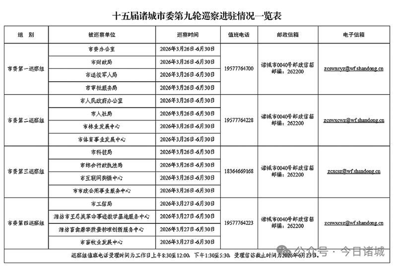 本轮巡察时间3个月左右。为便于干部群众反映情况,巡察组建立了多种联系方式(见附表)。根据有关规定,巡察组主要受理反映被巡察党组织领导班子及其成员、下一级党组织主要负责同志的来信来电来访,重点是关于违反政治纪律、组织纪律、廉洁纪律、群众纪律、工作纪律和生活纪律等方面的举报和反映。其他不属于巡察受理范围的信访问题,将按规定交有关部门办理。欢迎广大党员干部群众按照巡察受理范围,直接向巡察组反映有关情况和问题,鼓励实名举报。巡察组受理信访截止时间为2026年6月23日。